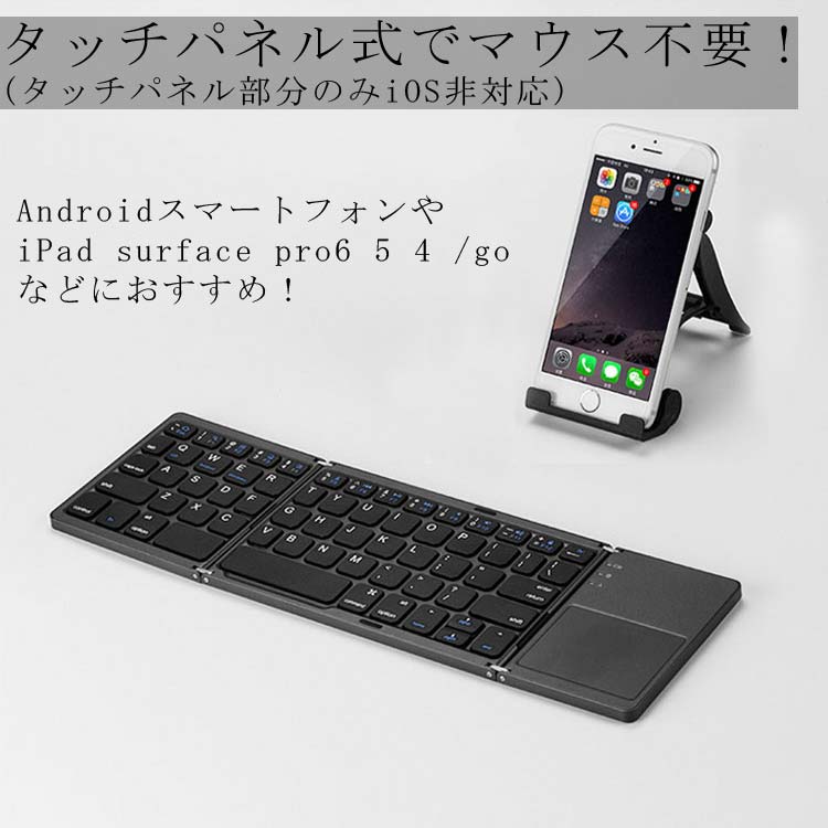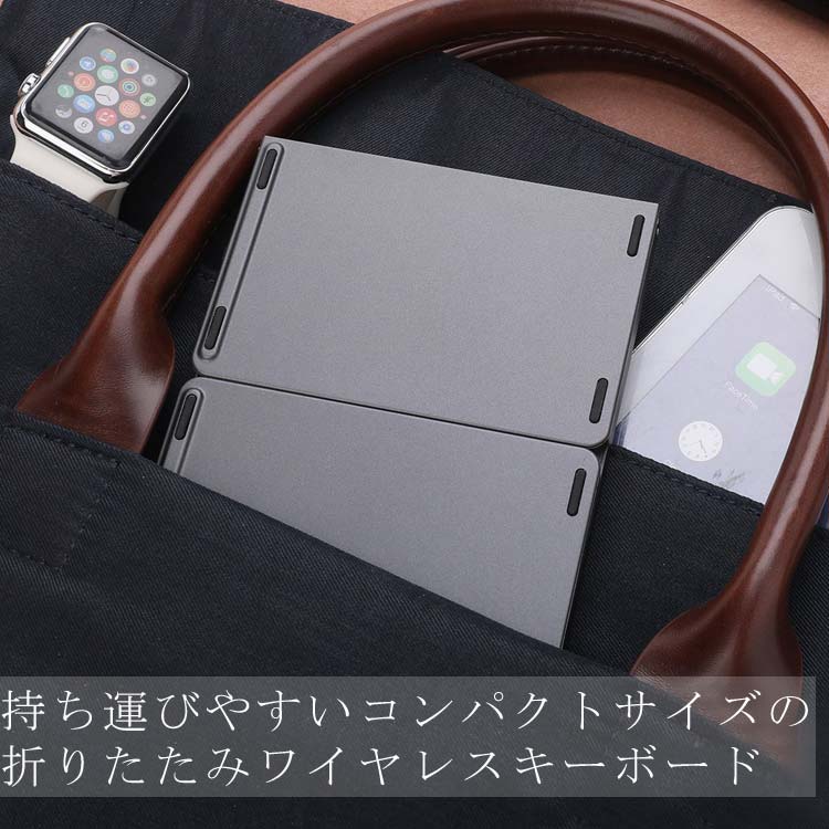 折りたたみ時サイズ:約W152×H97×D18mm 使用時サイズ:約W302×H97×D18mm タッチパッドサイズ:約W548×448mm 本体重量:約198g キー配列:英語配列(64キー) 対応OS:Apple Android Microsoft 接続: Bluetooth 電源:リチウムポリマー電池(内蔵) 充電用インターフェイス: USB 充電時間:約2時間 連続待受日数:約218日 ※使用環境により異なります 連続使用時間:約100時間 ※使用環境により異なります 対応機器:各種Windowsタブレット、各種Androidタブレット、スマートフォン、iPad Air、iPad mini、iPhone 対応OS:Android 4.1以降、iOS 6.0以降、Windows 8, 8.1 材質:アルミニウム及びプラスチック 内容:Bluetoothキーボード、キーボード充電用ケーブル、マニュアル(中国語、英語)